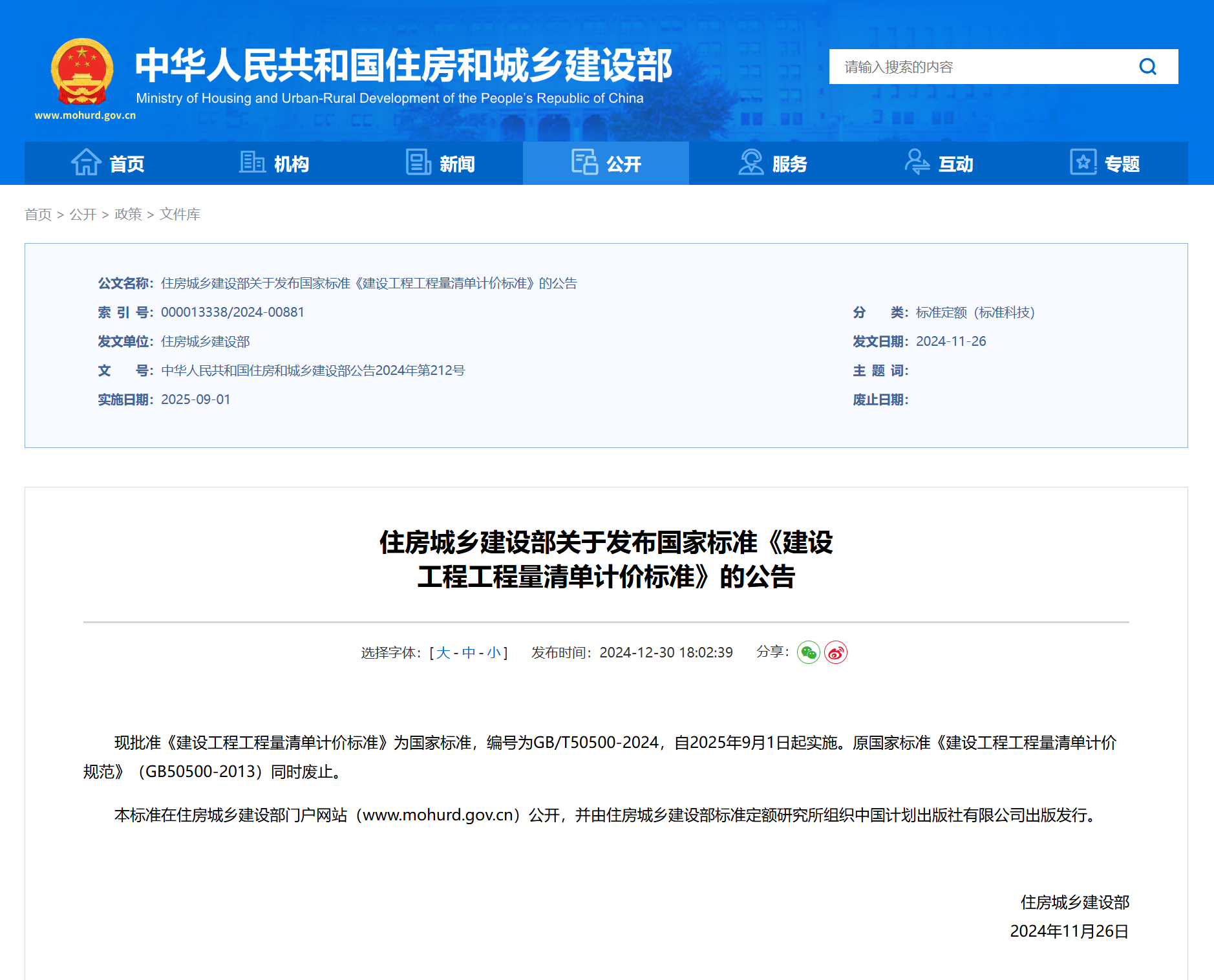 2024年11月26日,住房城乡建设部批准发布国家标准2024版《建设工程工程量清单计价标准》,自2025年9月1日起实施。原2013版《建设工程工程量清单计价规范》同时废止。
